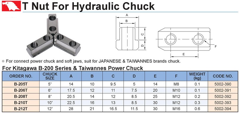 Đai ốc chữ T phù hợp các loại mâm cặp thủy lực.