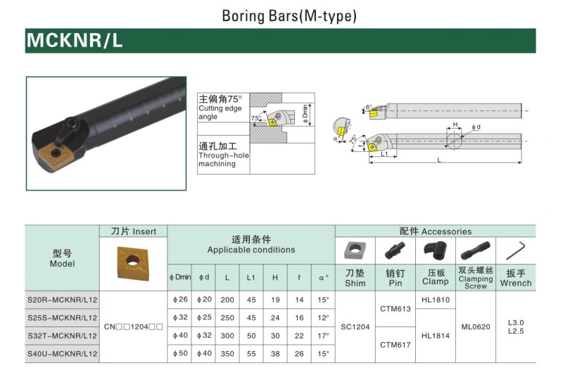 Cán dao móc lổ S20R-MCKNR12, S25S-MCKNR12, S32T-MCKNR12, S40U-MCKNR12, S20R-MCKNL12, S25S-MCKNL12, S32T-MCKNL12, S40U-MCKNL12 sử dụng nhiều trên máy tiện CNC, máy tiện cơ.