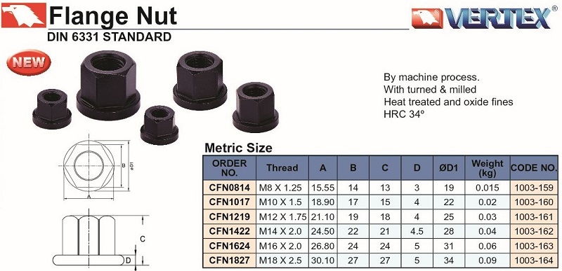 - Đai ốc mặt bích mã CFN0814, CFN1017, CFN1219, CFN1422, CFN1624, CFN1827 hãng Vertex, chuyên dùng trong việc kẹp chặt chi tiết trên bàn máy khi gia công cơ khí.